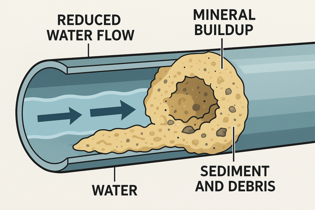 Pipe obstructions usually happen when minerals, such as calcium, build up on the walls of pipes. This accumulation limits the pipe’s diameter, leading to decreased water flow. Hard water is often the culprit, causing these build-ups of deposits.